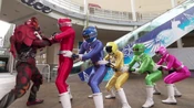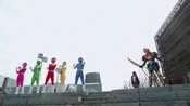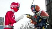 appears and confronts them. Overpowered by their new foe, the ToQgers are saved with the sudden arrival of Kamen Riders